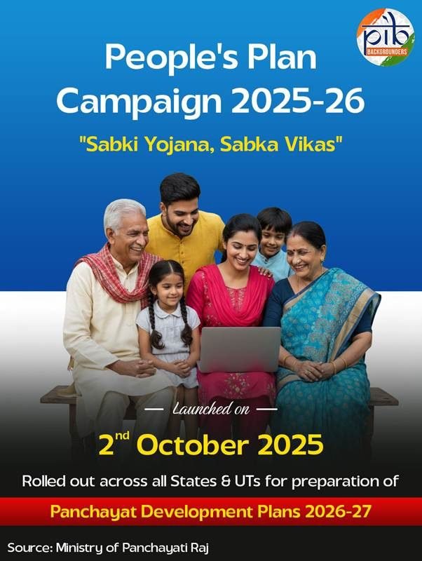 पंचायती राज मंत्रालय ने जमीनी स्तर पर लोकतंत्र को मजबूत करने और समावेशी विकास सुनिश्चित करने की दिशा में एक महत्वपूर्ण कदम उठाते हुए जन योजना अभियान (पीपीसी) 2025-26 की शुरुआत कर दी है। ‘सबकी योजना, सबका विकास’ थीम के तहत यह राष्ट्रव्यापी अभियान 2 अक्टूबर 2025 को सभी राज्यों और केंद्र शासित प्रदेशों में लॉन्च किया गया, जिसने वित्त वर्ष 2026-27 के लिए पंचायत विकास योजना (पीडीपी) तैयार करने की प्रक्रिया आरंभ कर दी है।