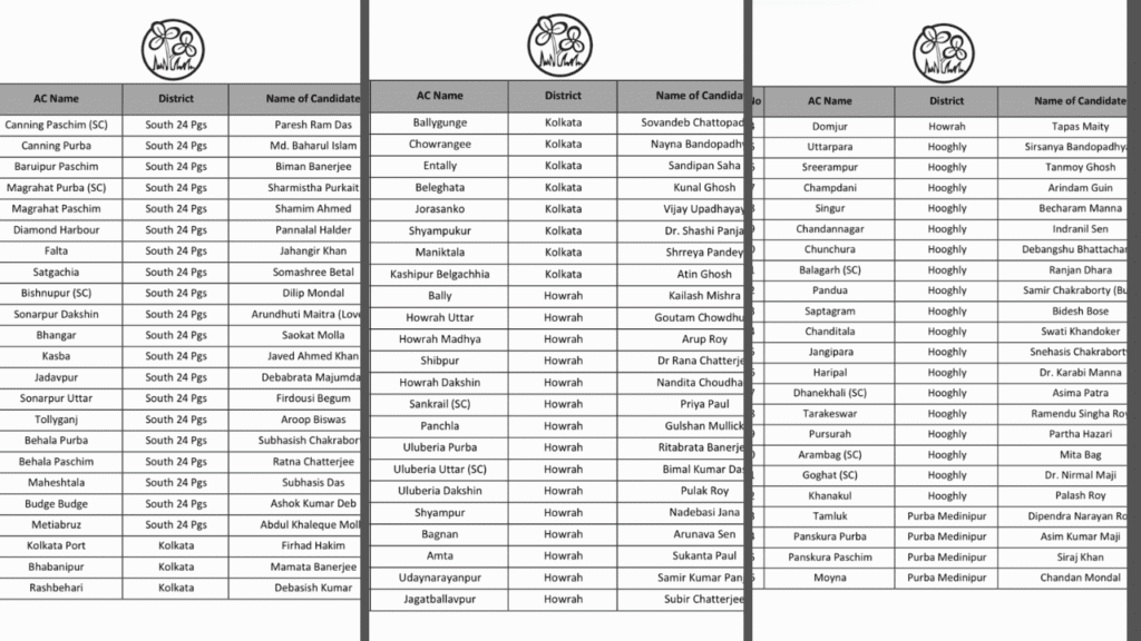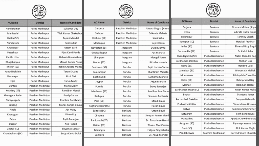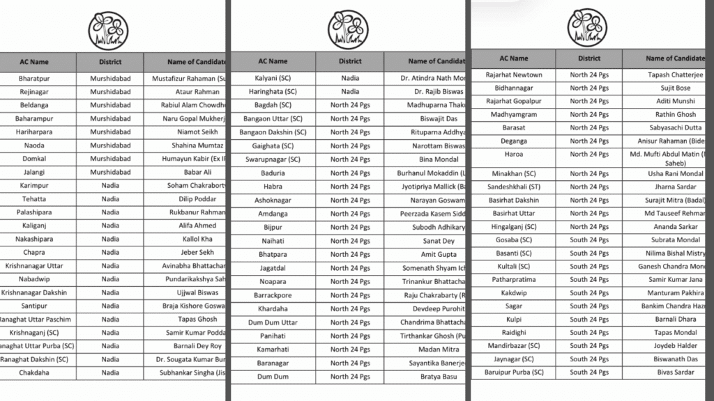टीएमसी की लिस्ट में महिला उम्मीदवारों की भी अच्छी भागीदारी दिख रही है। स्वरूपनगर से बीना मंडल, राजगंज से सपना बर्मन और सिताई सीट से संगीता रॉय बसुनिया को टिकट दिया गया है। पार्टी ने कृष्णानगर उत्तर से अभिनव भट्टाचार्य और कृष्णानगर दक्षिण से उज्जवल विश्वास जैसे भरोसेमंद नेताओं पर विश्वास जताया है। वहीं, कल्याणी से अतींद्रनाथ मंडल और राणाघाट दक्षिण से सौगत कुमार बर्मन को उम्मीदवार बनाया गया है।