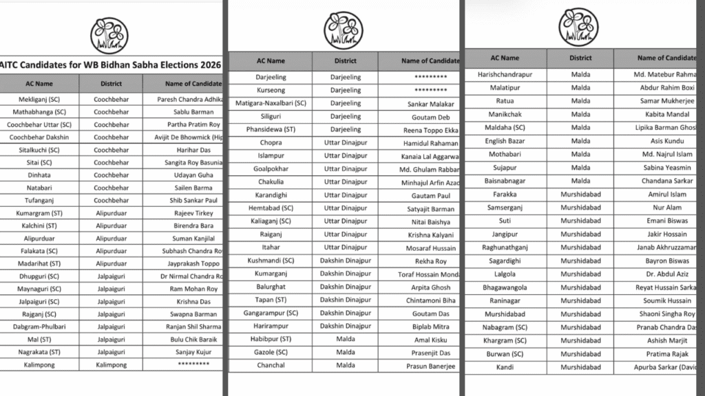 पश्चिम बंगाल विधानसभा चुनाव के लिए सियासी पारा अपने चरम पर पहुँच गया है। मंगलवार को तृणमूल कांग्रेस (TMC) की प्रमुख और मुख्यमंत्री ममता बनर्जी ने एक महत्वपूर्ण प्रेस कॉन्फ्रेंस में राज्य की सभी 294 विधानसभा सीटों के लिए अपने प्रत्याशियों की सूची जारी कर दी। टीएमसी की इस लिस्ट ने स्पष्ट कर दिया है कि पार्टी इस बार भी अपने पुराने दिग्गजों और नए चेहरों के मिश्रण के साथ चुनावी मैदान में उतर रही है।
